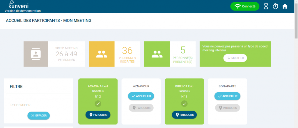 Avec Kunveni, l’organisation des événements en amont et la gestion complète de leur déroulement deviennent faciles et extrêmement efficaces. L’algorithme de l’application permet à chacun des participants de rencontrer chacun des autres une fois exactement. On évite ainsi les doubles rencontres avec une même personne et on évite que certaines personnes ne se rencontrent pas.