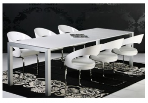 Dimensions 170 / 260 x 90 – Hauteur 74 cm – Epaisseur du plateau 9 mm – Bois MDF blanc laqué, structure aluminium brossé, pieds en aluminium – 679 € (au lieu de 999 €)