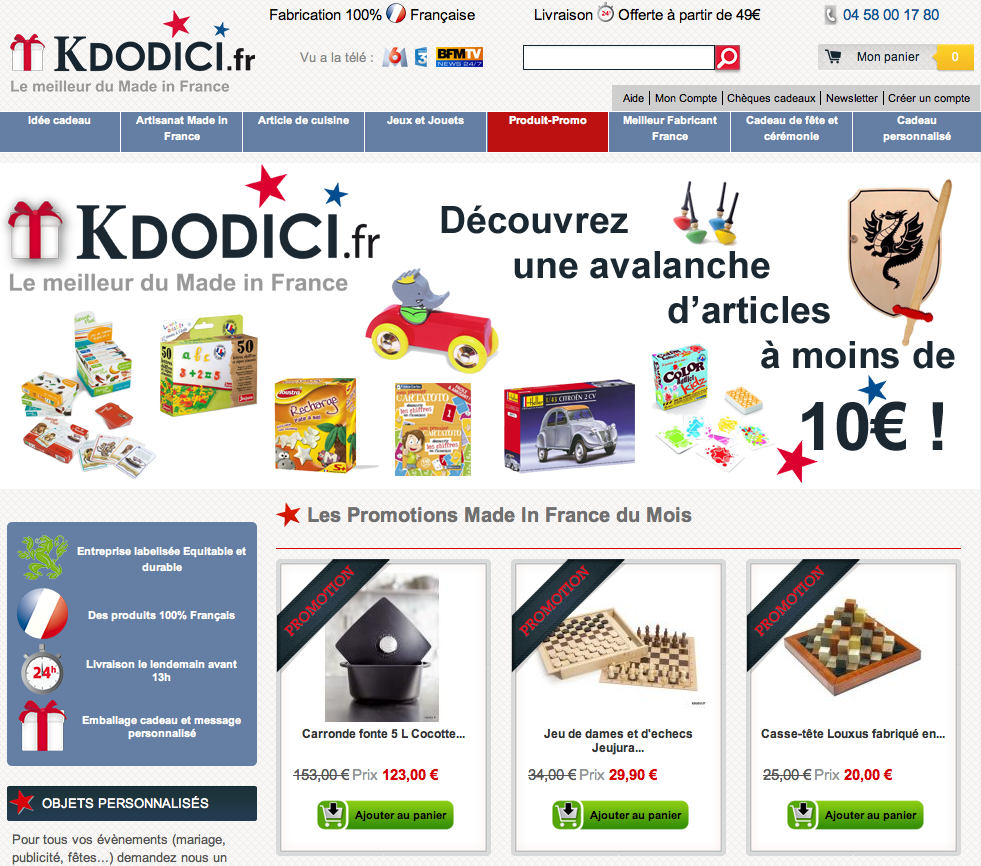 Depuis son lancement en mai 2012, la boutique en ligne KDODiCi tient son pari : soutenir et valoriser le savoir-faire unique des artisans français. Son créateur Olivier Serre sélectionne en effet des produits 100 % fabriqués en France pour offrir aux internautes un très grand choix de cadeaux pour tous les âges et tous les goûts.
