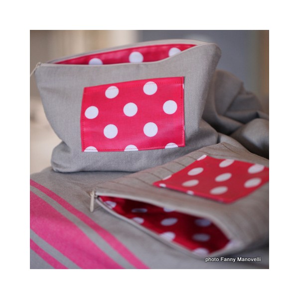 Trousse de toilette à pois roses en fouta taupe et toile enduite, entièrement doublée en toile enduite - 14 euros
