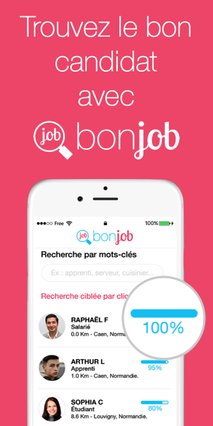BonJob est la première application à répondre exactement aux problématiques de recrutement du secteur de l’hôtellerie–restauration. C’est une solution mobile pertinente et efficace qui met en relation simplement et rapidement tous les acteurs des métiers de bouche.