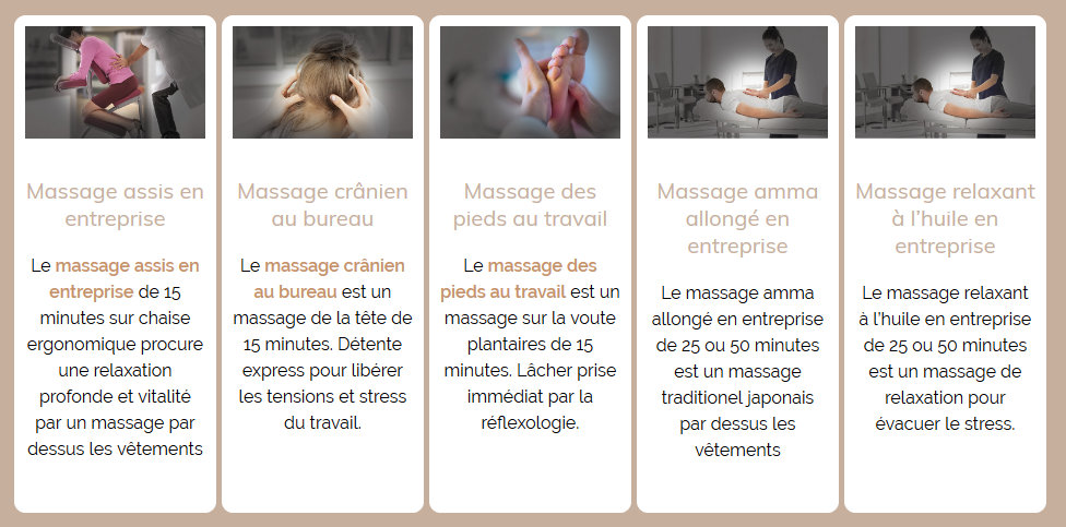 La société intervient alors au sein même des bureaux d’une entreprise pour du massage bien-être, des activités de team building, des initiations à la méditation (mindfulness), du Do-in (auto-massage japonais) ou du Shin Tai Do (gymnastique d’éveil).