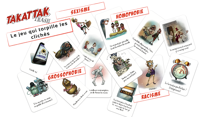 Takattak Trash est mon quatrième jeu ! Le premier Takattak a été lancé en 2014 suite à une forte demande de conseils des participants à mes formations. Ils me disaient qu’ils étaient bloqués quand on leur posait des questions délicates, des questions pièges ou même quand ils entendaient des commentaires (sur les blondes par exemple, ou les SDF) qui ne leur étaient pas adressés et qu’ils avaient envie d’intervenir.