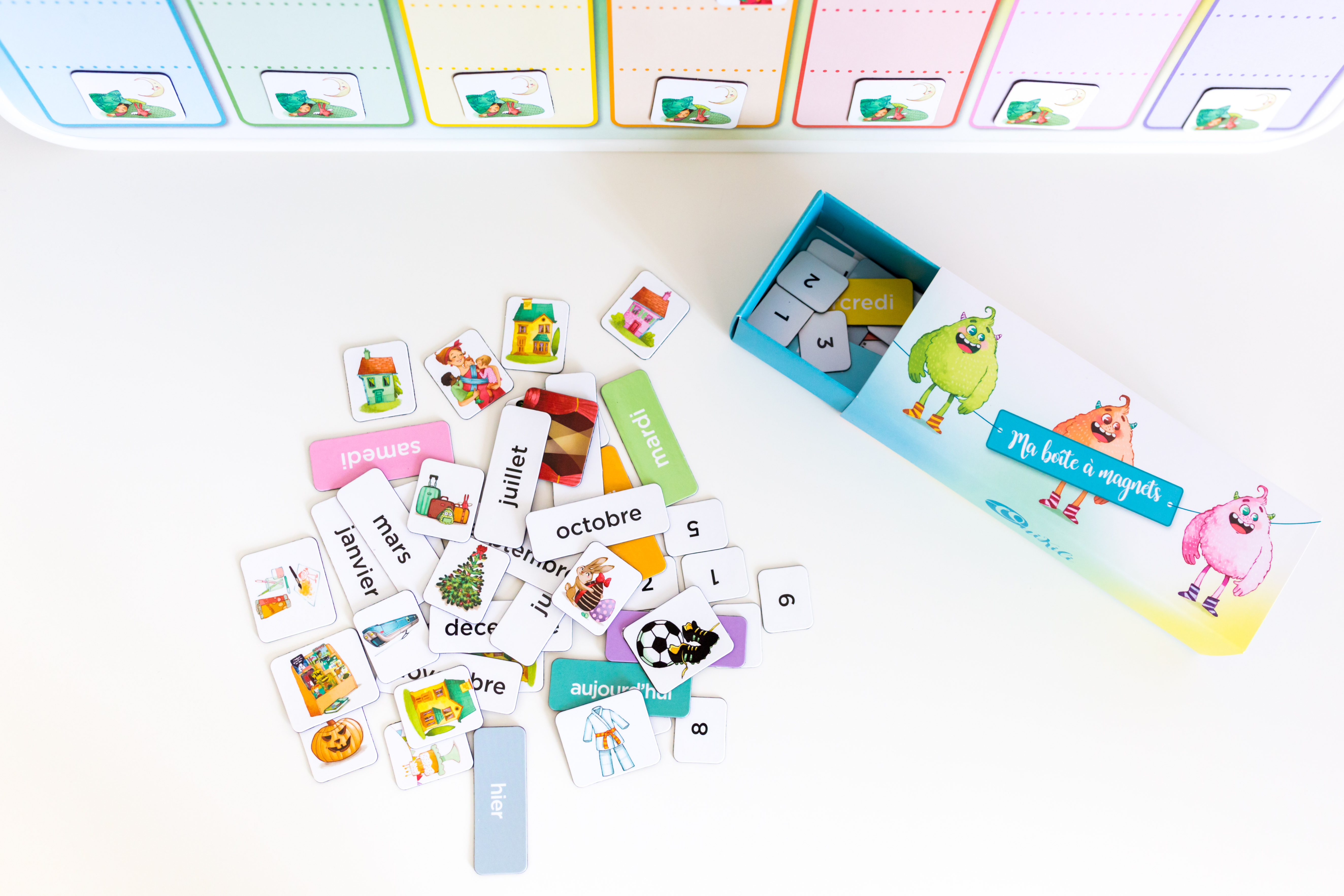 Ouikili est un outil pédagogique et ludique qui permet aux parents de traduire en image le planning de la semaine. Grâce aux dates en différentes écritures (majuscule, minuscule et cursive, et même en anglais !), l’enfant peut poursuivre à la maison le travail de reconnaissance des mots et apprendre les jours de la semaine.