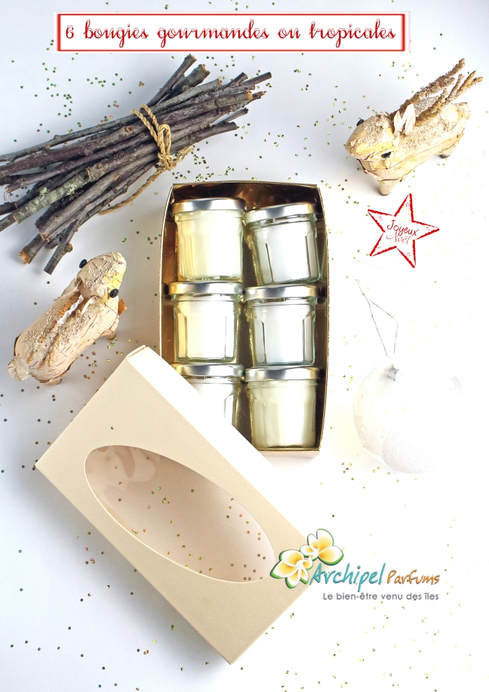 - Coffret de six senteurs gourmandes : Vanille, Caramel, Pain d’épices, Miel/Santal, Madeleine et Cannelle/Orange.