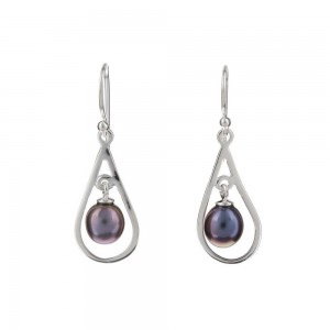 Boucles d’oreilles poire, en argent 925, ajourées de perles de culture grise.