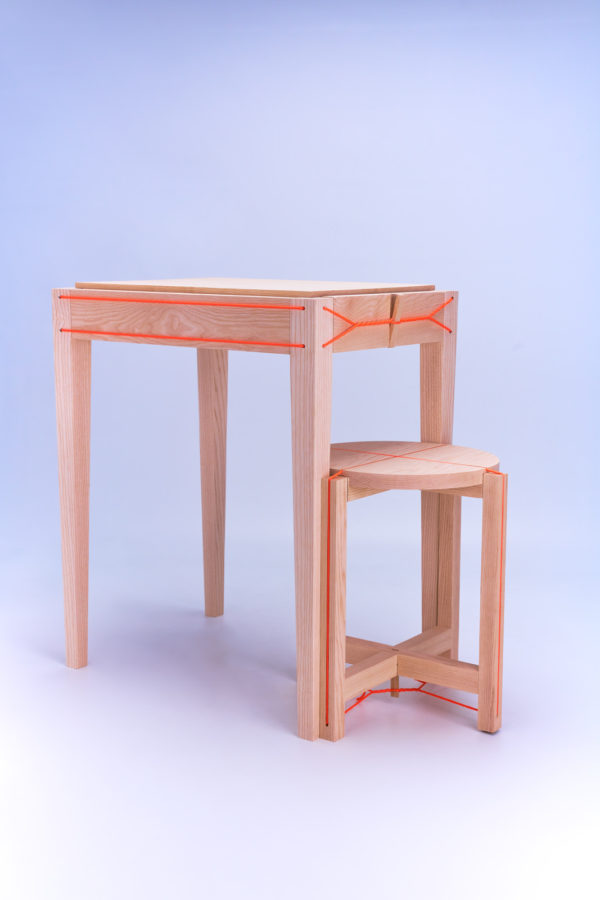 En effet, chaque élément de la collection Pol – table, chaise et tabouret – résulte de l’emboîtement astucieux de pièces en frêne maintenues par des cordelettes. Ces dernières sont fabriquées en Dyneema®, matériau sélectionné pour ses propriétés de robustesse et de résistance à l’abrasion. Déclinés en bleu Klein et en orange vif, leurs coloris procurent à l’ensemble son caractère contemporain et tonique. Leur serrage s’effectue à l’aide d’une clé en bois livrée avec le mobilier, clé qui peut être remplacée par tout autre objet du quotidien.