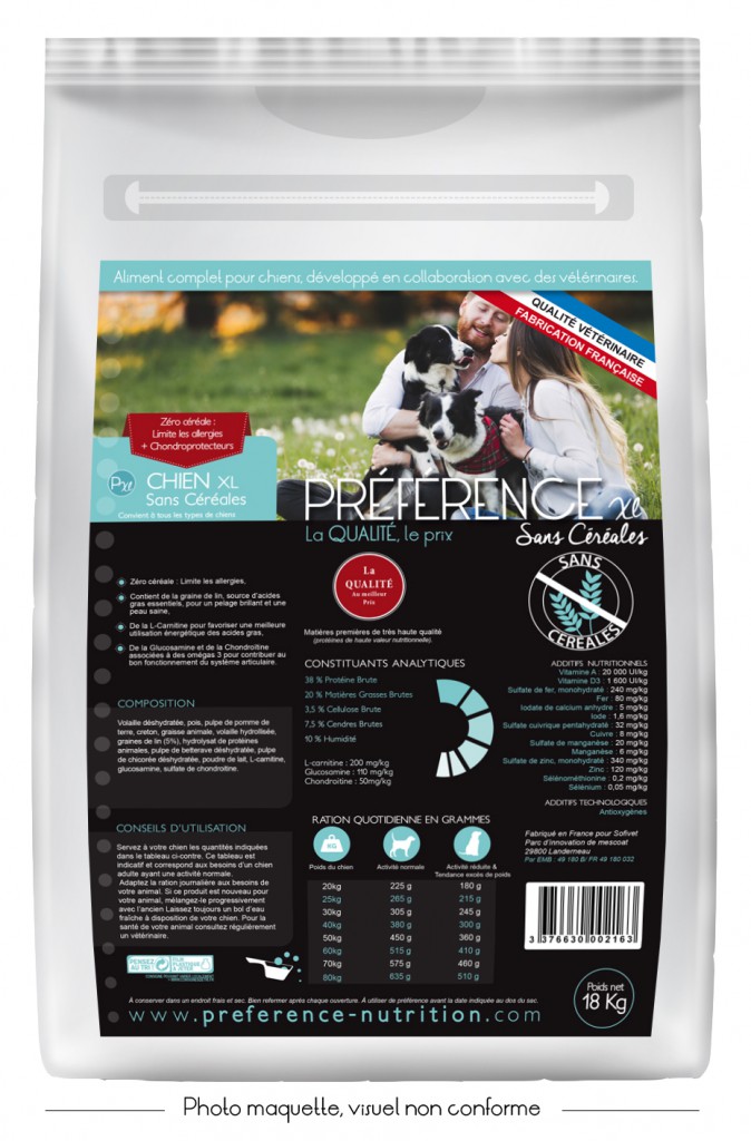 Préférence XL est une gamme destinée aux propriétaires de grands chiens et aux multipropriétaires. Elle est distribuée en sacs de 18 kg, et est fabriquée en France dans le respect des normes européennes.