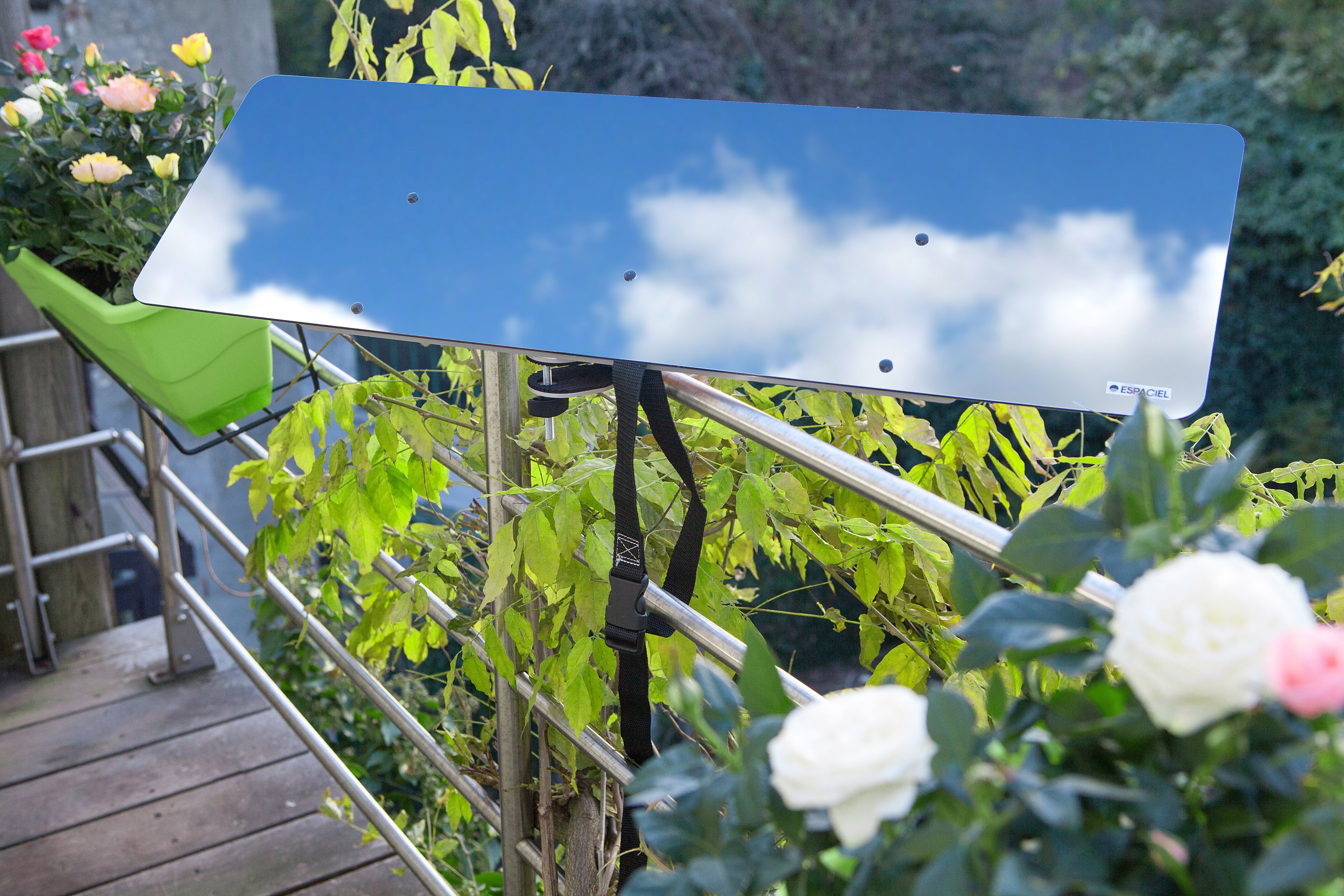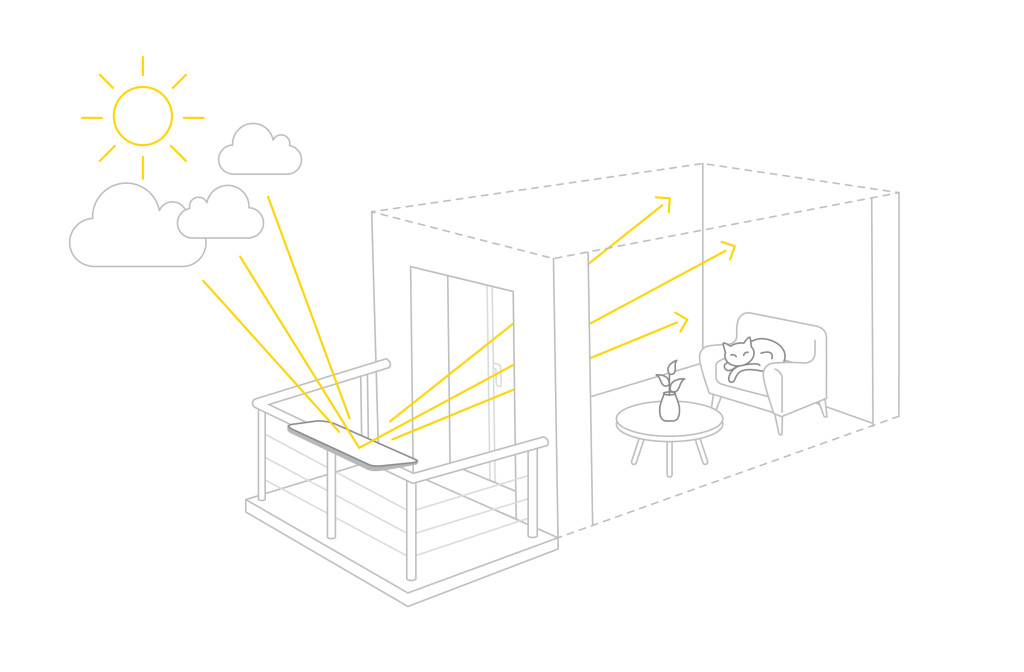 Les réflecteurs se placent tout simplement devant une fenêtre, sur un balcon ou sur une terrasse. Grace à l’effet du miroir réfléchissant, la luminosité du ciel est captée et re-transmise à l’intérieur du logement afin de bénéficier d’une pièce plus lumineuse. Les réflecteurs Espaciel permettent de bénéficier de 50% de lumière supplémentaire.