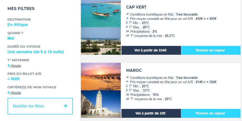 Il suffit de rentrer quelques critères, la destination (Europe, Amérique, Océanie, …), la période à laquelle on souhaite partir, la durée, la température moyenne recherchée, son budget et le type de voyage souhaité (roadtrip, séjour à l’hôtel, bord de mer, …).