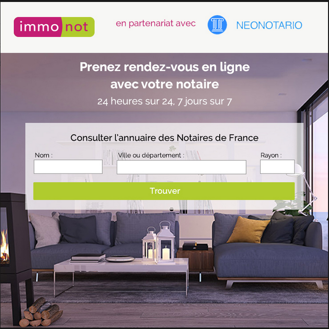 - Immonot, la référence pour les annonces immobilières notariales : pour la prise de rendez-vous avec un notaire, le trafic de l’annuaire sera redirigé vers NeoNotario.