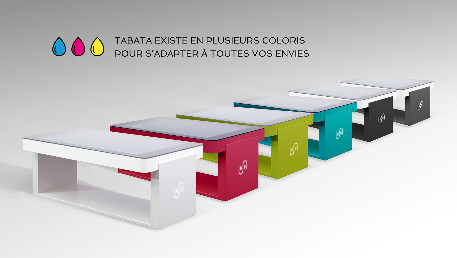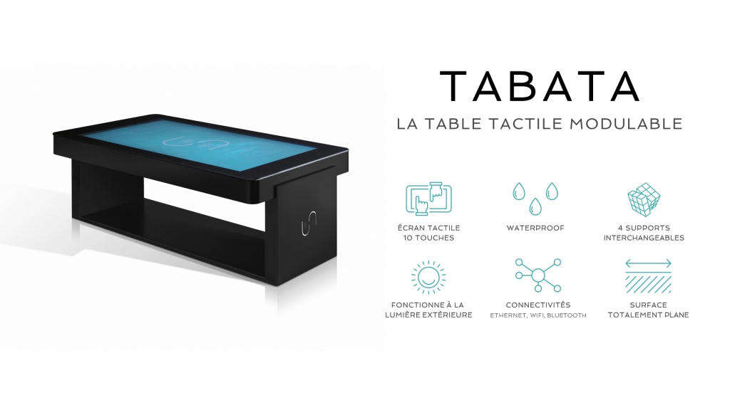 Dotée de 4 supports interchangeables, la table basse TABATA se transforme en un clin d’œil en bureau, en pupitre ou en écran mural pour offrir un support tactile et connecté inédit. Grâce à sa technologie Capacitif Projeté, TABATA est totalement waterproof, utilisable à la lumière extérieure et dispose d’une surface totalement plane de dix points de touche.