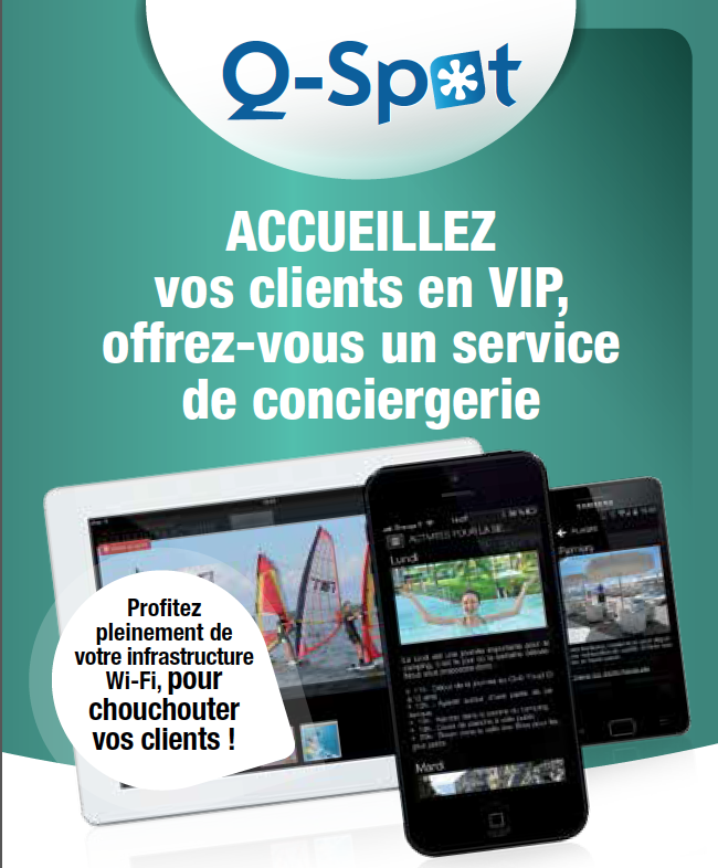 En complément de ses solutions Wi-Fi, Q-SPOT permet à ses clients d’exploiter pleinement leur réseau grâce à des produits innovants et performants. Q-SPOT a ainsi demandé à son partenaire Lounge Up de développer une application de conciergerie numérique. Avec TOUCHCAMP, les professionnels du tourisme profitent d’un outil relation client, simple et rapide, convivial et proactif.