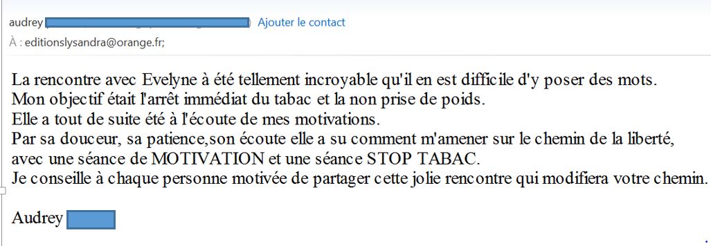 Dans son cabinet, Évelyne a souvent reçu des personnes souhaitant s’arrêter de fumer. Elle leur proposait la méthode traditionnelle en une séance, comme la plupart des praticiens. Elle s’est toutefois aperçue que cela ne suffisait pas : « Certaines personnes reprenaient de fumer dès qu’un stress important se manifestait dans leur vie ».
