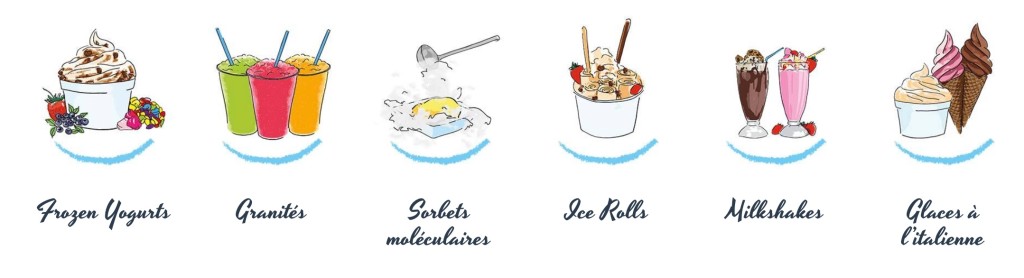 Plusieurs bars sont proposés : le bar à yaourts glacés, avec ses toppings gourmands, le bar à granités, avec ses sorbets frais à base de glace pilée, et le bar à sorbets moléculaires, où on peut déguster de délicieux cocktails frais transformés en sorbets grâce à l’azote liquide. Instant-B organise également des animations ice rolls, milkshakes, et glaces à l’italienne.