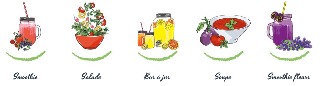Cette animation met en avant des produits de qualité et des mets sains et vitaminés. Au menu : un bar à jus de fruits frais, un bar à smoothies, où les boissons colorées sont servies dans des verres en cône, un bar à salade personnalisable qui permet à chacun de composer sa salade en choisissant féculent, viande et garniture, un bar à soupes et veloutés, et les smoothies fleurs, une nouveauté originale.
