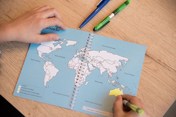 - Une double page « carte du monde » à colorier pour se repérer (le pays de résidence, les endroits déjà visités, les destinations de rêve…).
