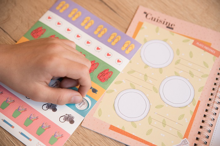 - Une planche d’autocollants en couleur, que l’enfant peut placer librement selon les activités réalisées.