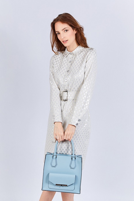 Ses boutons sur les épaules et sa ceinture intégrée agrémentée de deux boutons fantaisies en métal argenté lui donnent un look actuel. Sa forme droite est légèrement cintrée à la taille sans être moulante.