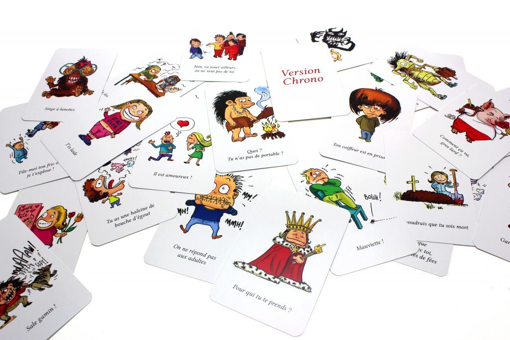 Avec la carte CHRONO, selon la couleur de la flèche sur laquelle vous tombez, vous devrez user d’autodérision, répondre par une pirouette, vous pourrez même être un peu insolent, voire rétorquer à votre persécuteur par une question pour le mettre dans l’embarras ou le désarçonner avec un compliment. Et puis, pour un mercredi après-midi marrant en famille, sortez la carte DINGO. Vous serez tenu de faire preuve de créativité parce qu’il faudra riposter en chanson, inventer des gros mots, mimer votre réplique, la faire rimer ou répondre par une onomatopée. De quoi vous inspirer quand vous retournerez à l’école.