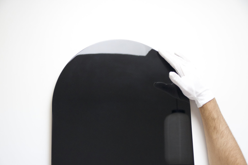 En Japonais, le mot Shikkoku désigne le noir de jais, un noir si profond qu’il en devient lumineux. Ce miroir oblong utilise les propriétés réfléchissantes de l’Urushi, la laque japonaise : c’est une véritable œuvre d’art, entre miroir et peinture.