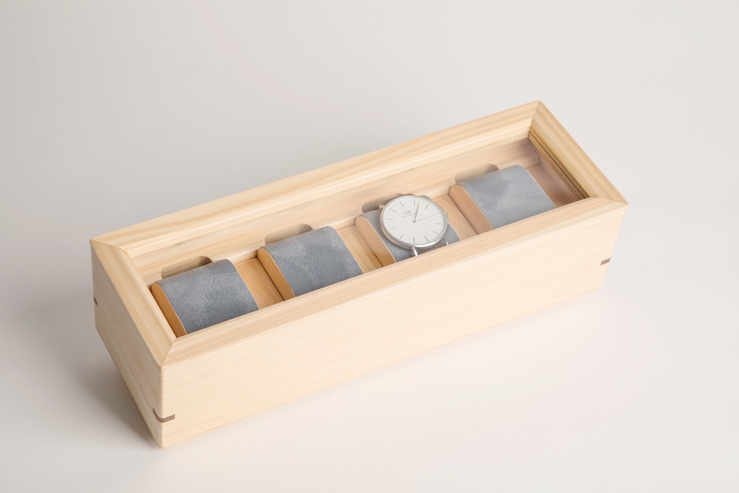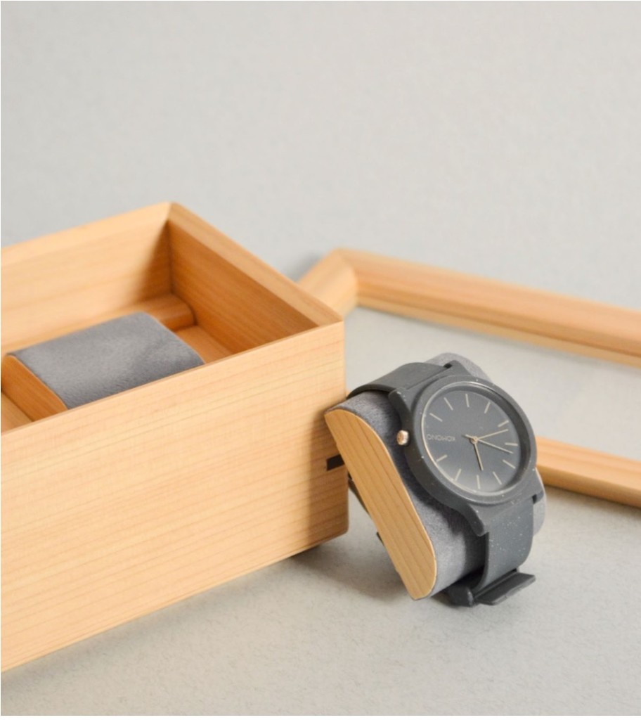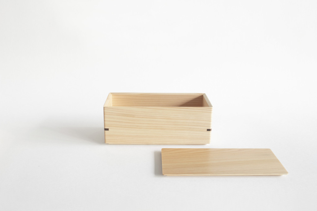 D’allures minimalistes, les boîtes sont fabriquées en bois de noyer et de Hinoki, le cyprès japonais, avec la technique Kumiki.