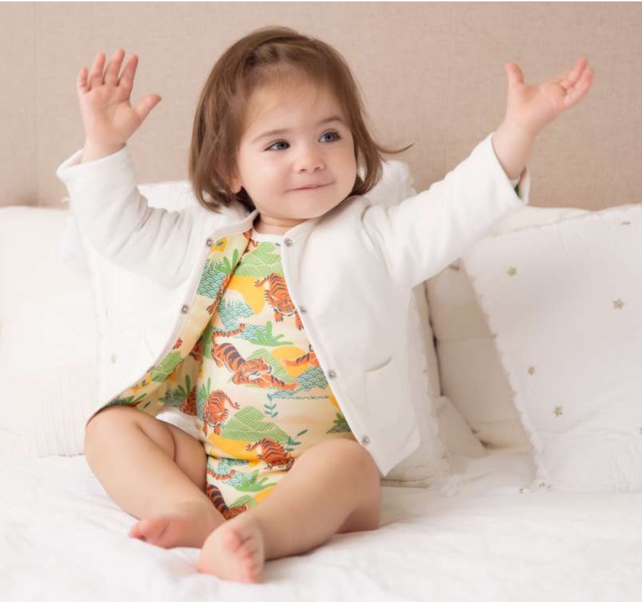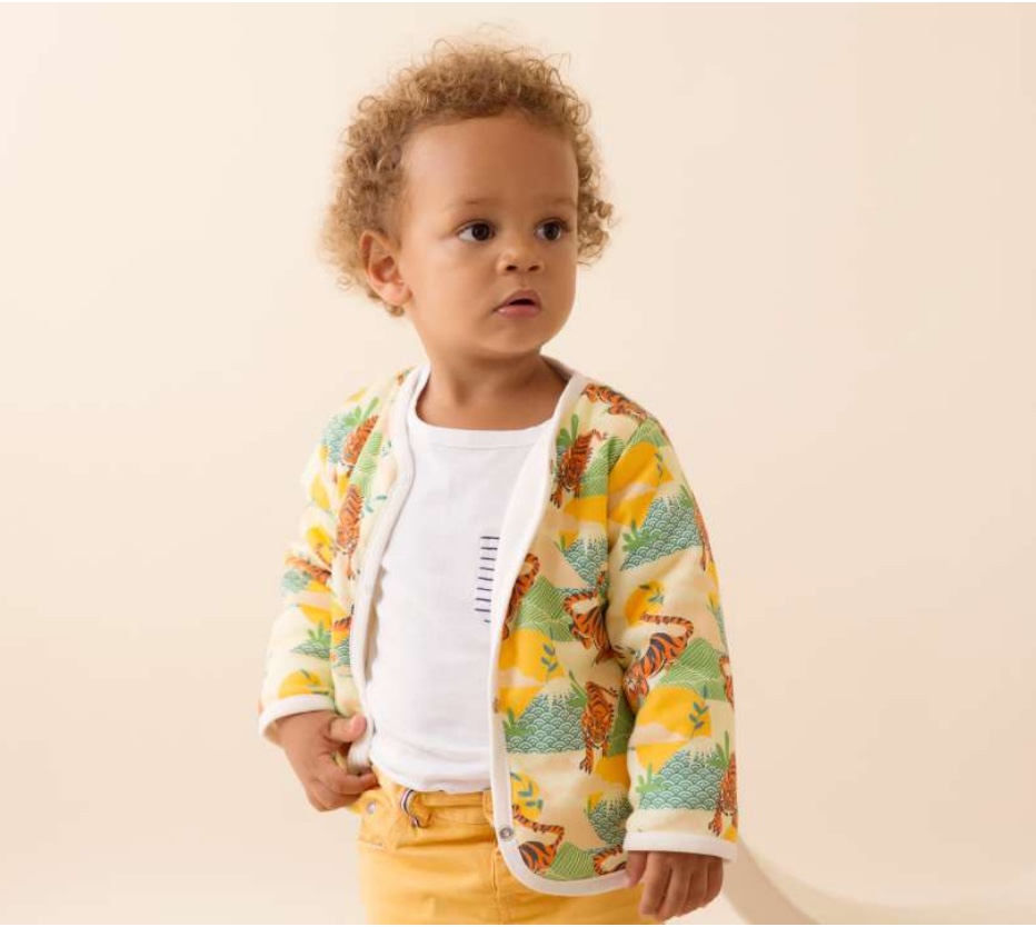 Ce coffret cadeau contient un body manches longues imprimé à encolure américaine, et un cardigan réversible. L’imprimé du body est issu de la collection « Seigaiha », qui entraîne bébé à la découverte du Japon.
