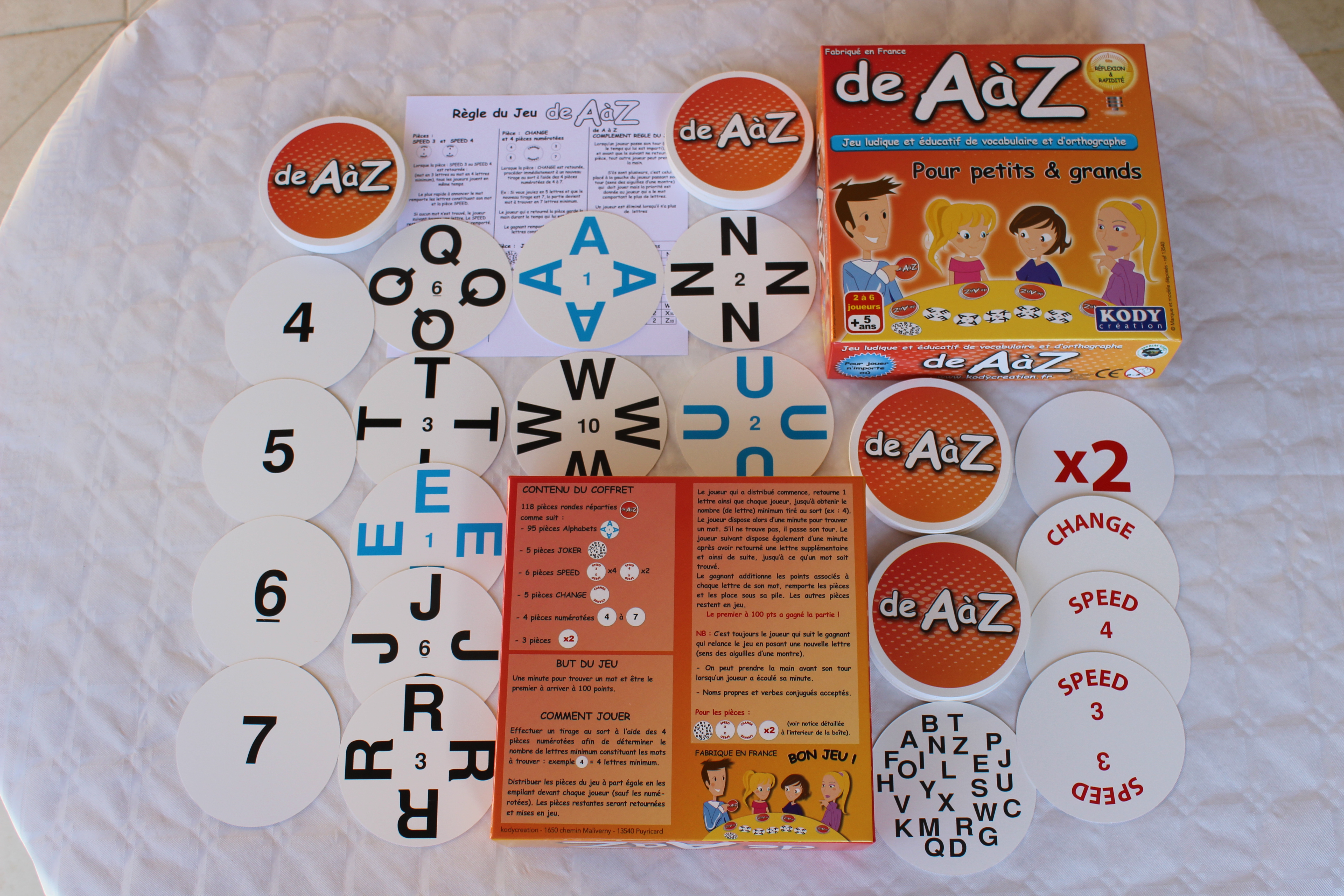 Entre scrabble et boggle, « de A à Z » est le nouveau jeu de lettres qui réunit tous les âges, à partir de 6 ans. Facile à jouer, chaque joueur ou équipe doit trouver un mot en moins d’une minute à partir des lettres retournées sur la table. Chaque mot trouvé totalise une valeur de points, le gagnant est le premier à avoir obtenu 100 points. Mais attention, des cartes spécifiques viennent corser et dynamiser le jeu. Mêlant réflexion et rapidité, les parties sont rythmées !