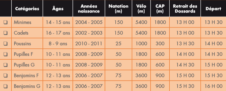 Tableau des départs et des distances en fonction de la catégorie du jeune.