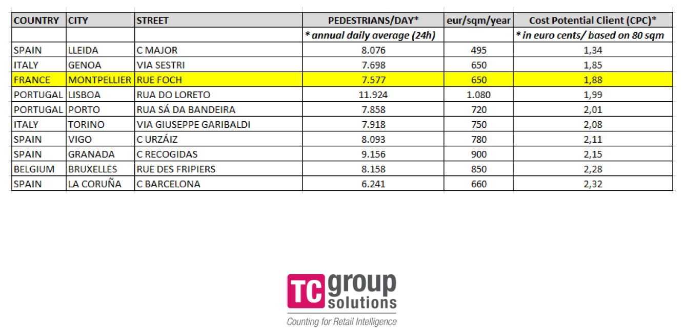 TC Group Solutions, grâce à plus de 10.000 senseurs de comptage de trafic piéton installés dans les rues commerçantes des principales villes européennes, a réalisé une étude pour calculer et comparer le « Coût par Client Potentiel » (CCP) de 100 rues commerçantes dans 8 pays d’Europe, basée sur le coût du loyer commercial et du trafic piéton (Clients Potentiels) qui passent devant ces commerces.