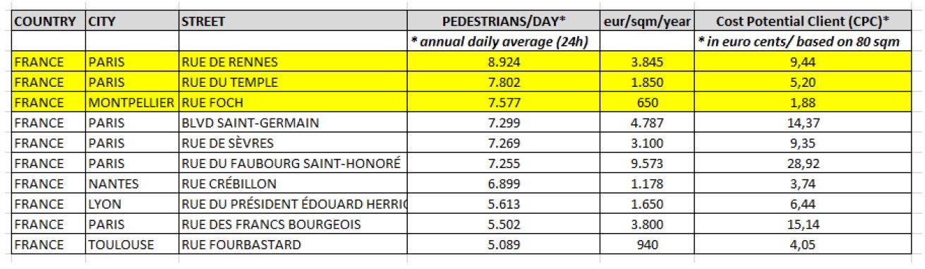 La rue de Rennes à Paris est l’artère française la plus fréquentée, avec une moyenne journalière de 8.924 piétons, suivie de la rue du Temple aussi à Paris avec 7.802 piétons journaliers et la rue Foch à Montpellier avec 7.577 clients potentiels qui passent tous les jours devant les vitrines des locaux commerciaux, à une distance maximale de 5 mètres.