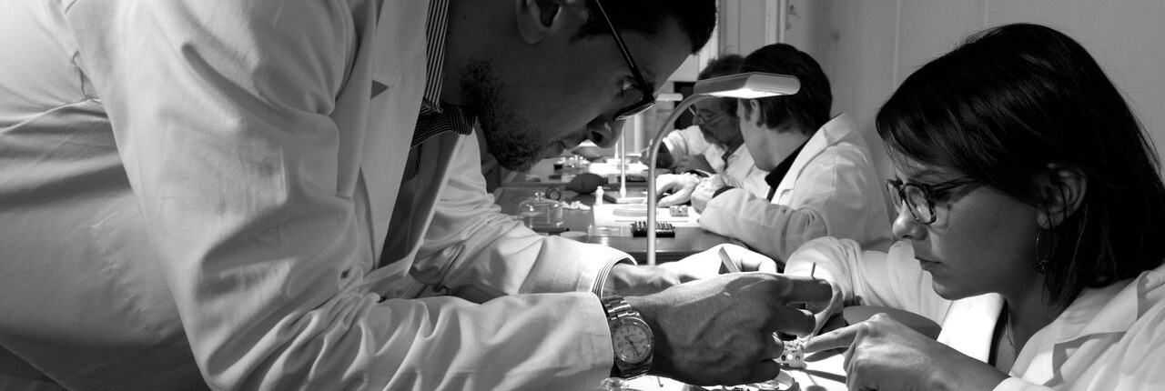 Blouse blanche, ambiance rigoureuse mais conviviale, les apprentis prennent place derrière leur établi, règlent leur siège et se laissent guider par les experts horlogers instructeurs.