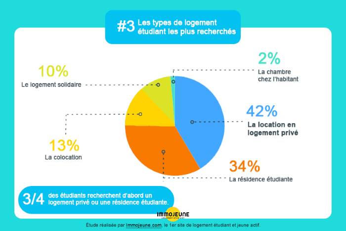 En premier choix, les étudiants en quête d’indépendance sont plus de 42% à souhaiter s’installer dans une location privée telle qu’un appartement ou un studio. Pour autant, les résidences étudiantes ont toujours le vent en poupe ! Ils sont 34% à vouloir s’installer dans ces résidences qui proposent des services tels que : laverie, salle de sport, ménage… et à vouloir accéder à des espaces de co-working et vivre des soirées étudiantes.