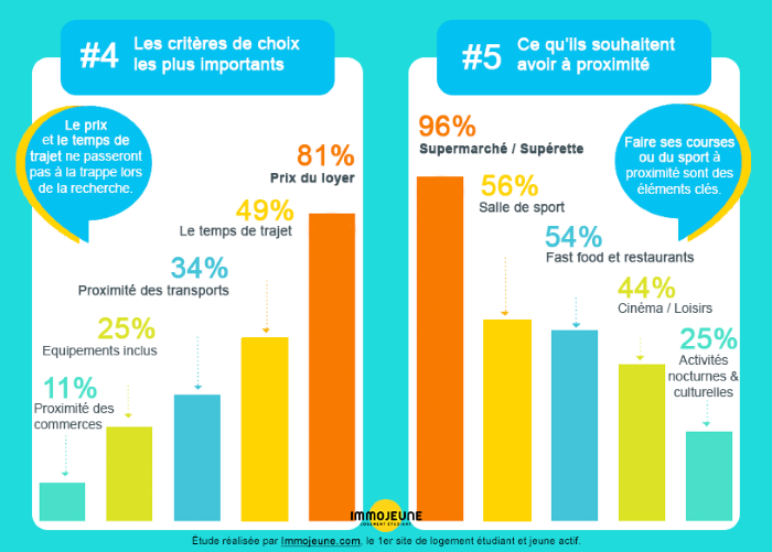 Les étudiants ont leurs exigences et certains critères ne passeront pas à la trappe comme : le prix du loyer, le temps de trajet et la proximité des transports. Autant d’éléments qui vont rythmer leur quotidien. De plus, 96% des étudiants souhaitent pouvoir faire leurs courses à proximité, accéder à une salle de sport, ainsi que profiter de restaurants, de loisirs et idéalement d’activités nocturnes et culturelles.