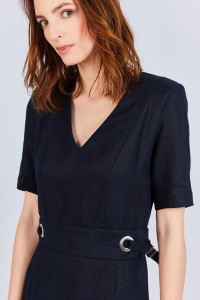 Céline est une robe droite, entièrement doublée, avec son encolure ronde, sa ligne féminine, sa ceinture incrustée parée de deux boutons en métal argenté et ses passants sur les épaules pour une allure résolument moderne. Sa noble matière, son zip dos invisible, sa longueur genou accentuent l’élégance et la féminité de chacune.