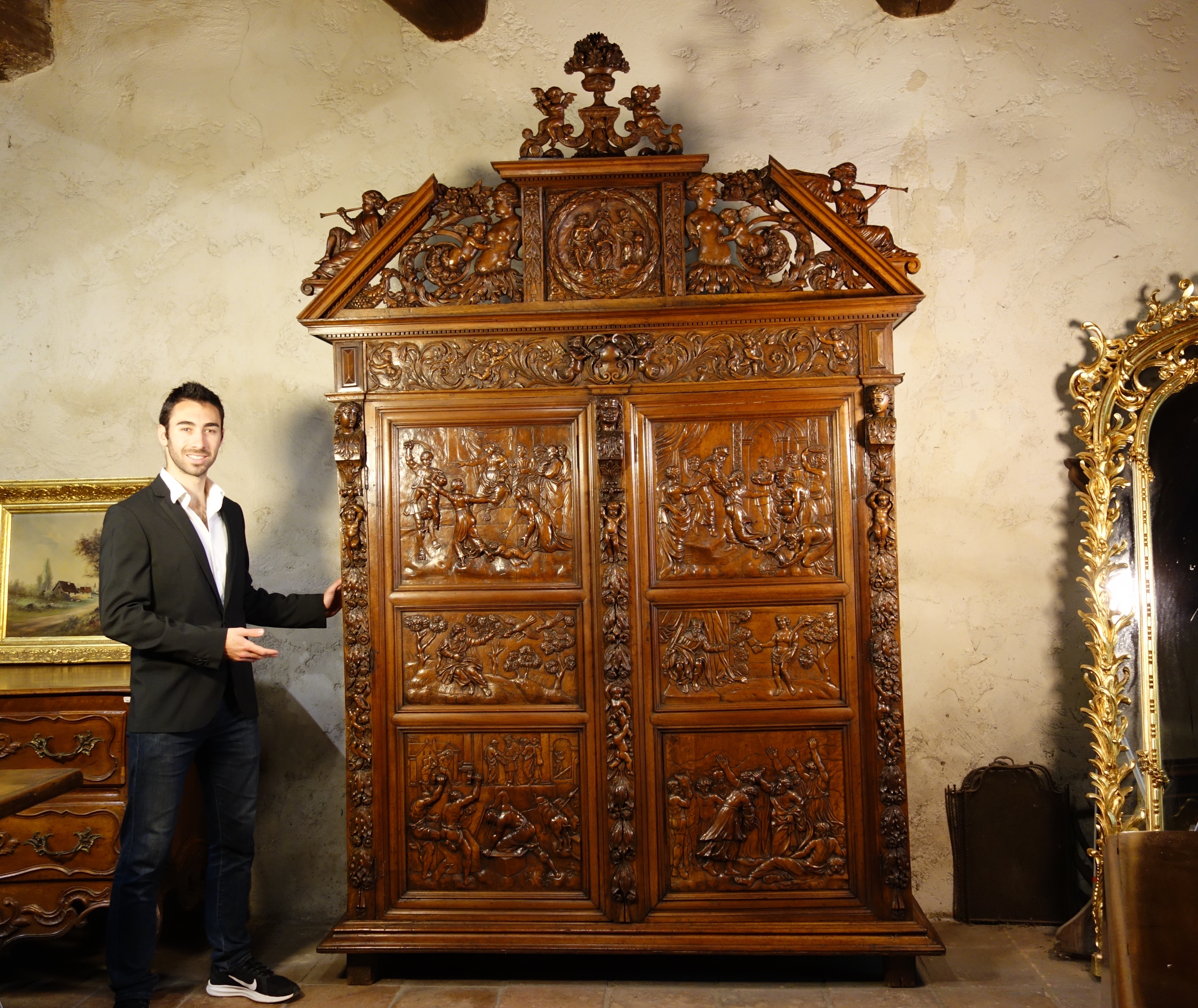 Comme ses semblables, l’armoire de Méounes Antiquités est en noyer et présente des proportions massives : 285 cm de hauteur pour 183 cm de largeur. Elle entre dans la catégorie la plus rare : celle des armoires historiées à six panneaux. La structure, calquée sur les portes du baptistère Saint Jean à Florence, atteste de l’origine italienne de cette pièce historique.