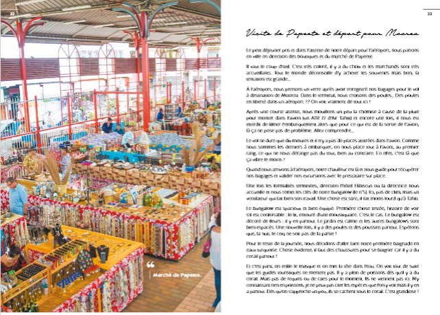 Au fil des pages, les lecteurs retrouvent les photos des paysages tels que Sébastien les a vues, un descriptif de tout ce qu’il a visité, mangé ou encore les activités qu’il a pu pratiquer, telles que la nage avec des requins, avec des raies, le jet ski…