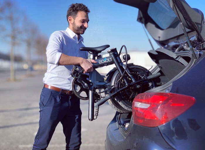 - on va au travail en combinant les modes de transport : une partie en voiture ou en transport en commun (EOVOLT peut être déplacé même une fois plié), et l’autre partie en VAE (dans les centre-villes par exemple)…