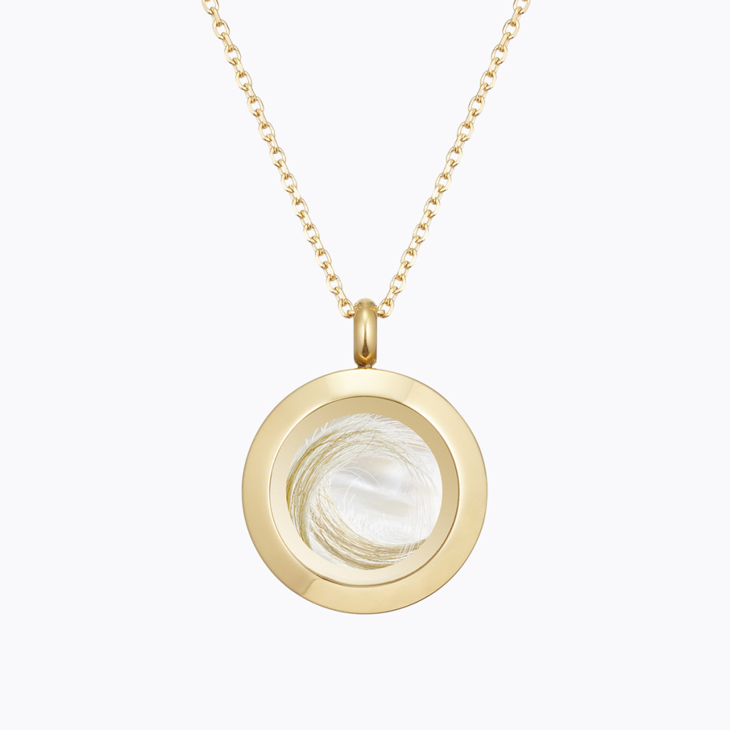 Elle n’a conservé que l’essentiel : l’amulette prend la forme d’un cercle doré habillé d’un disque de nacre, dans lequel on peut glisser une mèche de cheveux ou tout autre petit trésor.
