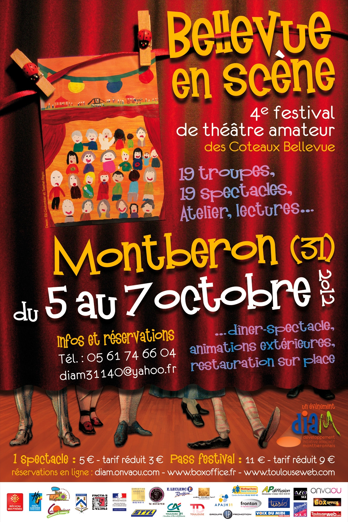 Pour sa quatrième édition de « Bellevue en scène » Montberon vivra au rythme des festivaliers en compagnie de 19 troupes de théâtre amateur.???? Pour compléter ces représentations théâtrales, le DIAM proposera cette année encore des animations, des stands, un concours de dessins pour les enfants afin de réaliser l’affiche de Bellevue en scène 2013, un éco-bus qui fera la navette entre les différents sites…