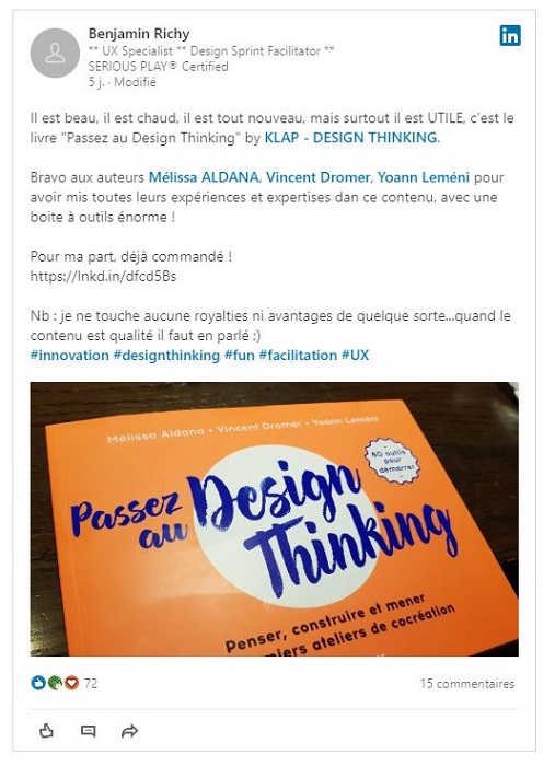 Rédigé par un trio d’experts (Vincent Dromer, Mélissa Aldana et Yoann Leméni), ce livre s’appuie sur une solide expertise : avec leur société Klap.io, ils ont organisé et animé plus de 400 ateliers de Design Thinking auprès d’une communauté de plus de 6000 personnes.