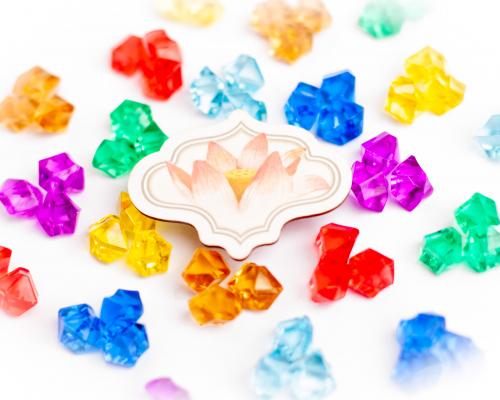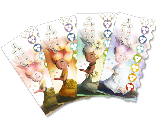 Chaque joueur possède un plateau représentant les 7 Chakras qu’il doit remplir de gemmes symbolisant l’énergie qui circule dans son corps.