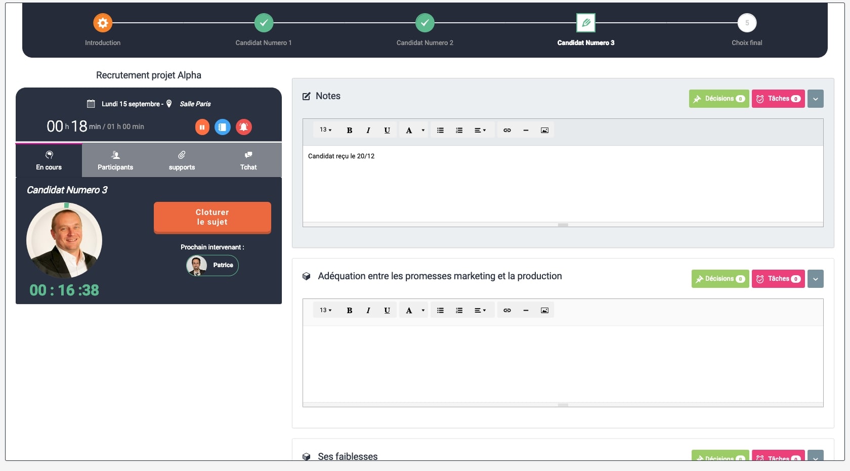 - Guide de réunion interactif : l’application génère une interface pas à pas, en fonction de l’ordre du jour. Les participants peuvent suivre sur leur ordinateur ou smartphone le compte rendu qui se compose et y contribuer.