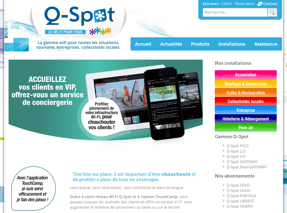 En Aout 2013, Q-SPOT qui n’avait jusque-là qu’un site professionnel à usage des installateurs, s’est doté d’un site grand public. Cette nouvelle adresse web permet à la fois aux propriétaires de s’informer et rechercher la solution Wi-Fi adaptée à leurs besoins et aux usagers de trouver les établissements avec Wi-Fi.
