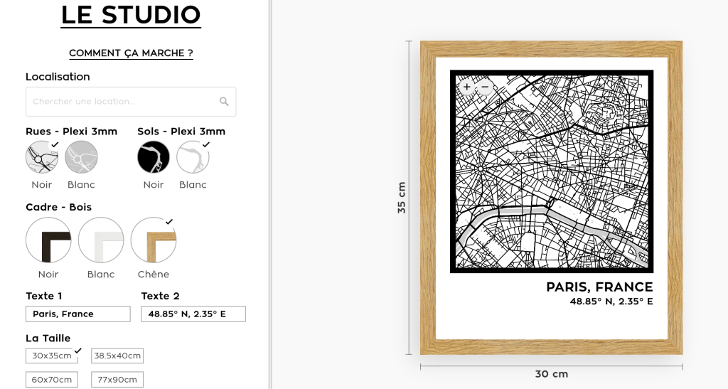 Les internautes souhaitant créer une carte personnalisée peuvent se rendre dans le « Studio » DeMurin. On peut y choisir une ville ou un village, zoomer sur un quartier ou une rue précise, et sélectionner la couleur des rues, des sols, et du cadre en bois.