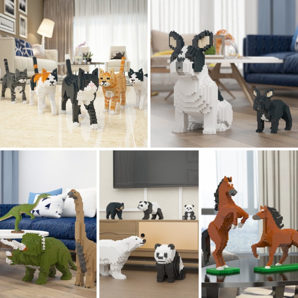 Les animaux JEKCA se déclinent en deux tailles : classique et grande. La sculpture du berger allemand au format classique fait ainsi 26,4 centimètres de haut, tandis que la grande en mesure près de 50. Comme les pièces utilisées pour les sculptures grande taille sont plus grandes que celles des jeux standards, le nombre de pièces est le même et le temps de montage n’est pas plus long.