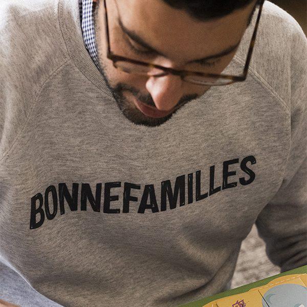 Sweat adulte en coton bio gris chiné, avec logo « Bonnefamilles »
