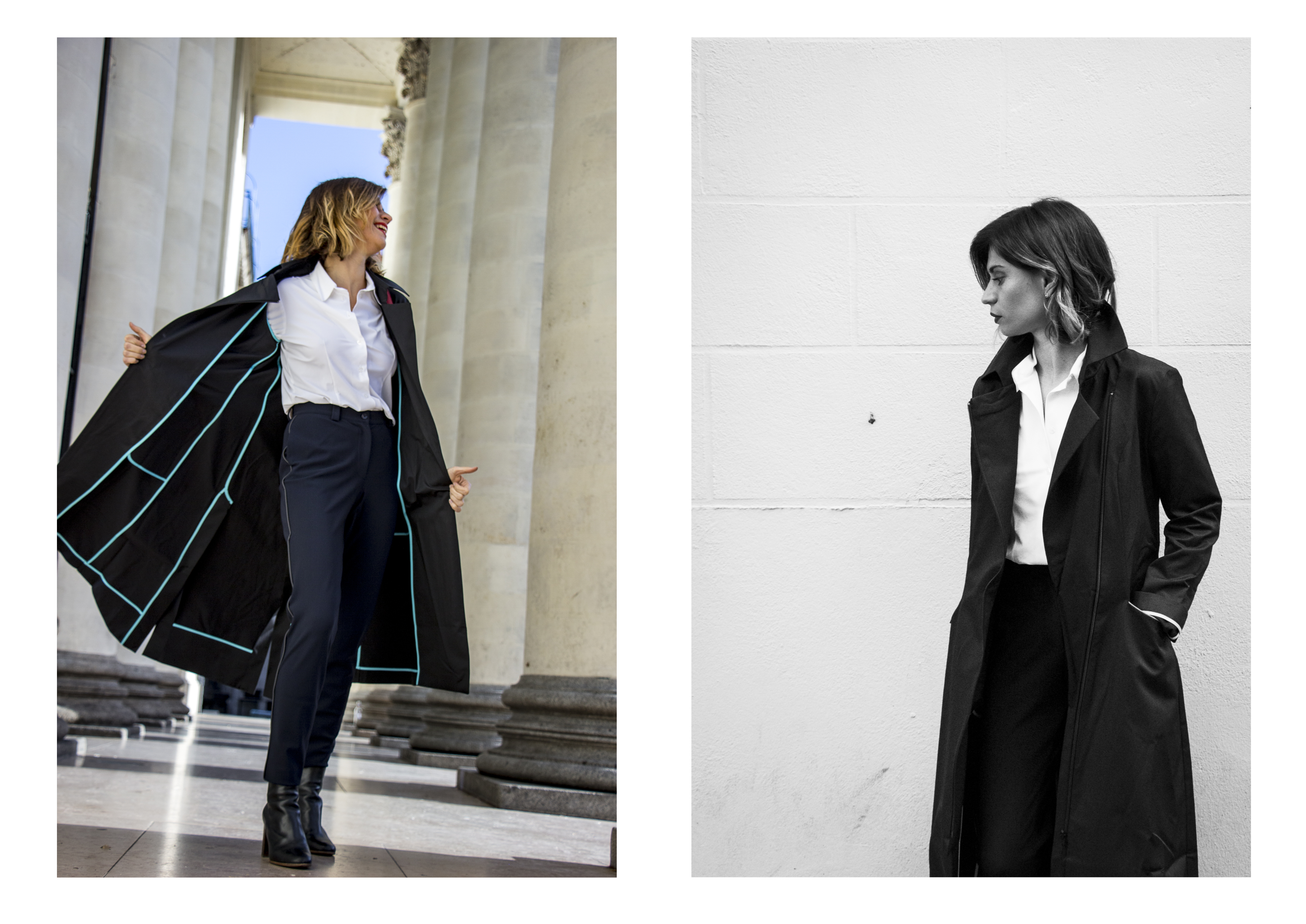 Des éléments rétro réfléchissants allongent la ligne du pantalon, en couture latérale. Ils soulignent la féminité de la coupe de la veste et du manteau. Cet atout de sécurité discret est la signature de Cyclamelle. Et celle de sa créatrice : le clin d’œil au smoking !