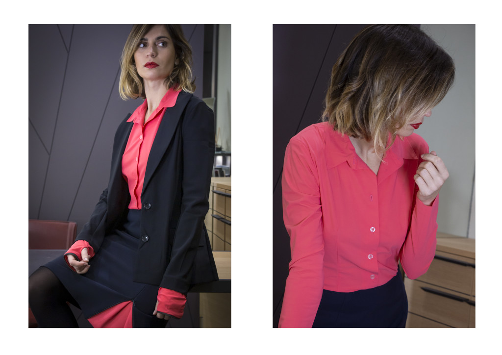 Le chemisier se porte manches longues ou, juste en les relevant sur les bras, manches trois quarts. Il se décline en quatre coloris : blanc, corail, noir et bleu lavande.