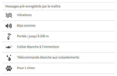 Les quatre commandes personnalisables émises par le collier permettent au chien de s’habituer au son de la voix de son maître qui peut attirer l’attention de son chien grâce au système de petits bips ou de vibration émis par le collier. Et si le chien s’éloigne, le collier et la télécommande peuvent communiquer même à 200 m de distance.